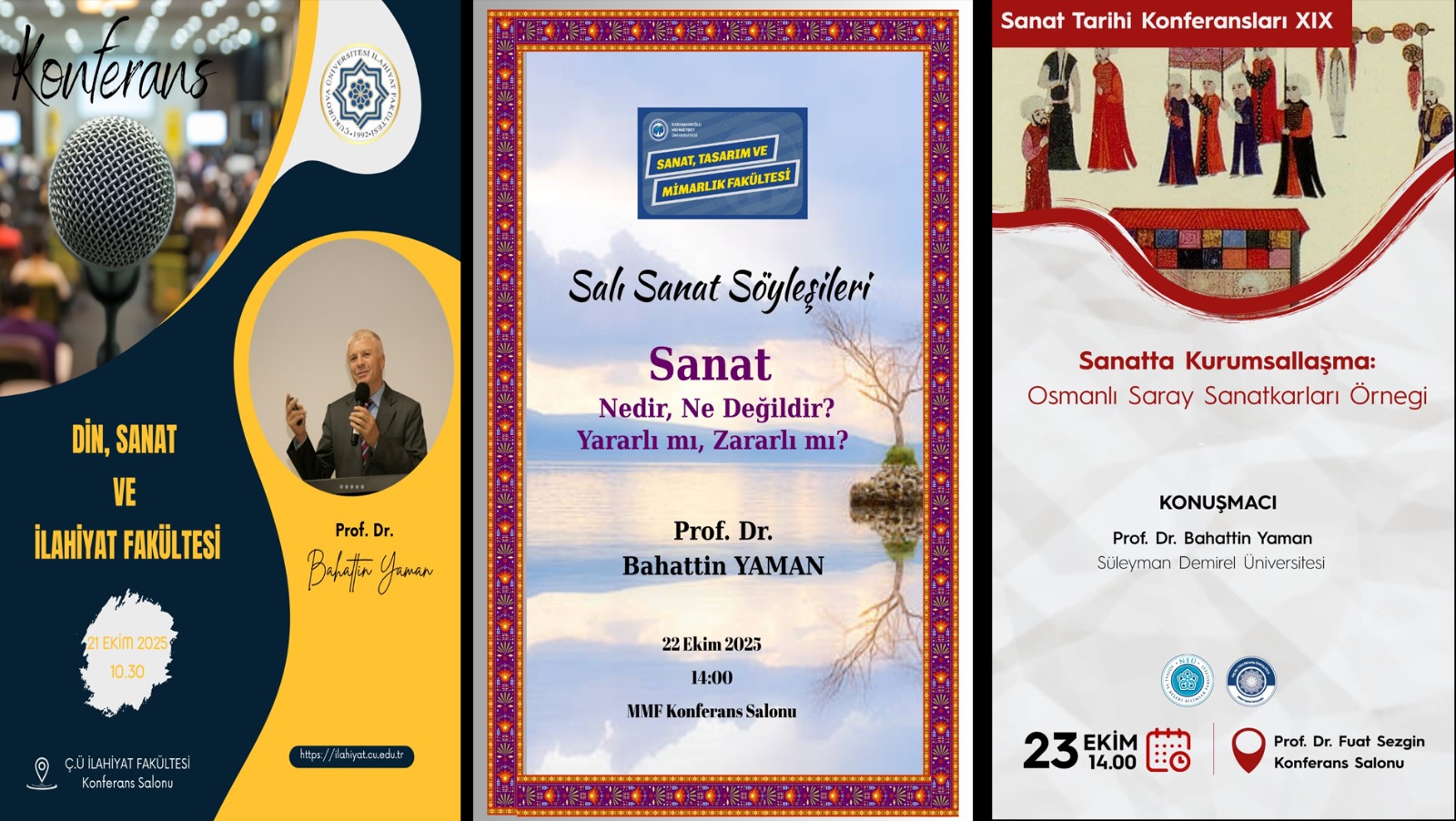 Fakültemiz İslam Tarihi ve Sanatları Bölümü, Türk İslam Sanatları Anabilim Dalı öğretim üyesi Prof. Dr. Bahattin Yaman, 21–23 Ekim 2025 tarihleri arasında çeşitli üniversitelerde düzenlenen konferans ve söyleşi programlarına konuşmacı olarak katılmıştır.